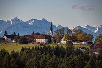 Klein dorp met kerk in de uitlopers van de Alpen bij Murnau, Beieren, Duitsland