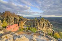 Uitzicht op de Prebisch Poort in het Boheemse deel van het Elbezandsteengebergte op een middag in de herfst.