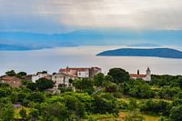 Wolkenstralen achter het dorpje Predošćica op het eiland Cres in Kroatië, met op de achtergrond het eiland Plavnik en de bergen op het Kroatische vasteland.