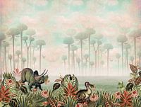 Volgens de laatste trends deze prent dinosaurus in retro vintage sfeer. De prehistorie met dinosaurussen op jullie muur. Een prachtige prent dinosaurus in gelijkende kleurtonen.