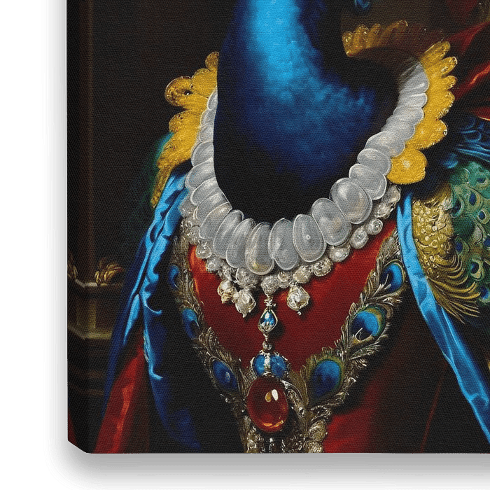 De pauw is gekleed in een indrukwekkend kostuum van rood fluweel , rijkelijk versierd met pauwenveren en glanzende stenen waardoor hij iets koninklijks…