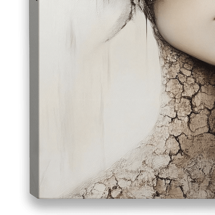 Portret van een vrouw met gesloten ogen, haar hoofd versierd met een grote, gedetailleerde roos en gebarsten, verweerde texturen. De serene uitdrukking contrasteert met de dramatische, aardse elementen die haar omringen.