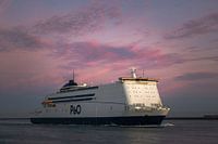 Veerboot Pride Of Rotterdam van P&O Ferries komt aan in Rotterdam op een mooie ochtend. De lucht is paarsig van kleur.