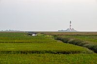 Priel met bruggen en vuurtoren Westerheversand op de achtergrond