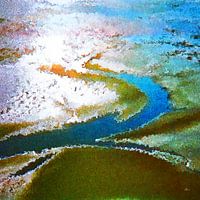 Waddenzee in het avondlicht vanuit vogelperspectief als een sterk geabstraheerde indruk in digitale aquarel ART met sproeitechniek en aquatint effect. © Dirk h. Wendt
