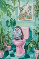 Te midden van weelderige groene planten zit een kleine egel op het roze toilet in een charmant speels tafereel en bestudeert het laatste nieuws. Deze grillige aanblik brengt lichtheid en humor in elke badkamer en verandert de ruimte in een vrolijke oase die uitnodigt tot glimlachen. Ideaal om een persoonlijk tintje aan te geven!