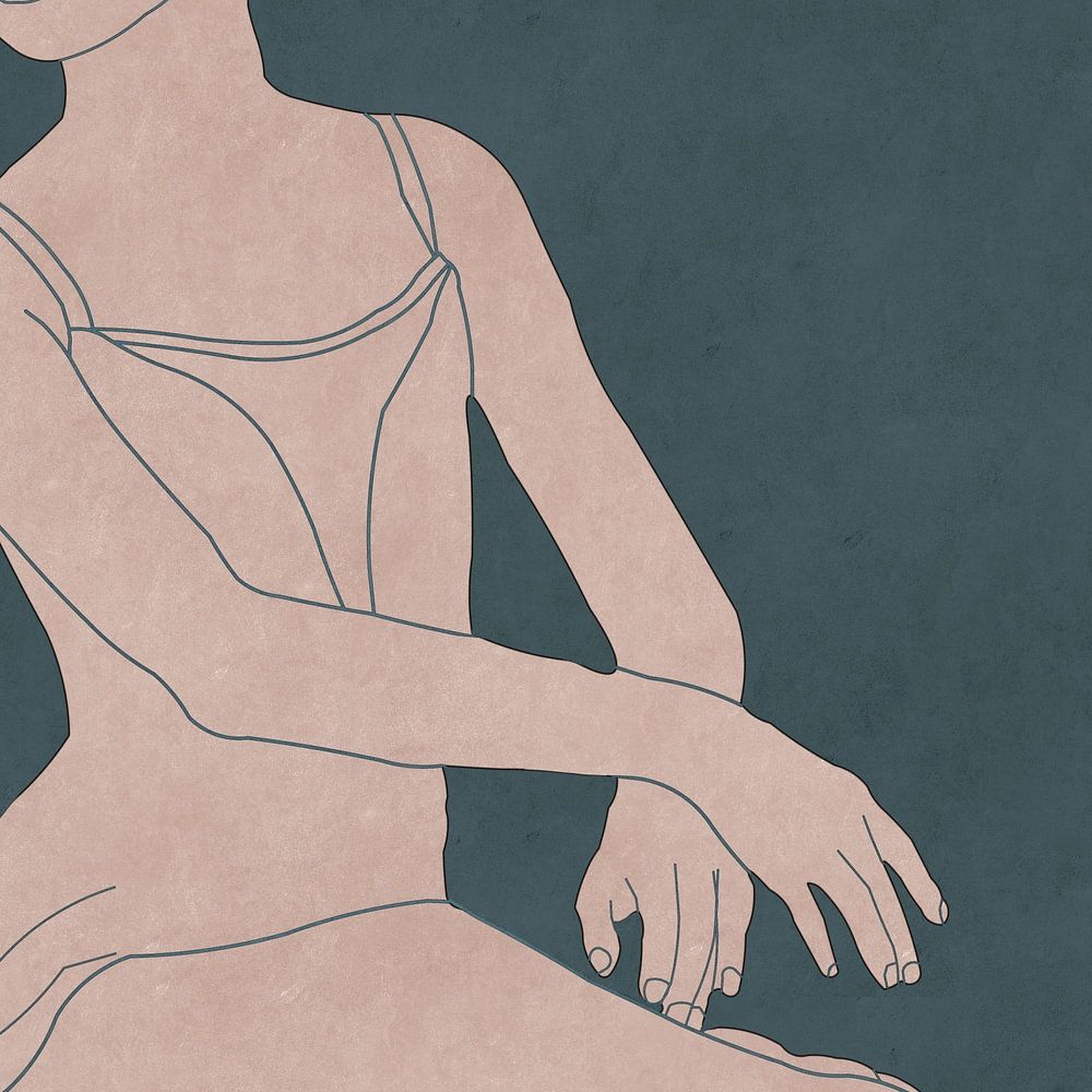 Minimalistische lijntekening van een prima ballerina op een lichtgrijze achtergrond.