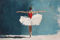 Een elegante ballerina, volledig gefocust in haar beweging, zweeft bijna in haar gracieuze rode kostuum tegen een contrasterende blauwe achtergrond. De beweging en kracht van haar dans stralen vrijheid en artistieke expressie uit, terwijl ze op het toppunt van haar kunnen lijkt te balanceren. Een bijzondere blikvanger voor je interieur!