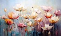 Vrolijk abstract schilderij met wilde lente bloemen in zachte pastel tinten.