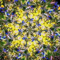 Een caleidoscopisch beeld met veel beweging, met geel als hoofdkleur, gebaseerd op een foto van oenothera, een plant die in het Nederlands teunisbloem genoemd wordt en in het Engels bekend staat als evening primrose.