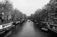 Zwart wit foto van de Prinsengracht in de Jordaan in Amsterdam. Samen met de Keizersgracht en de Herengracht is dit een van de belangrijkste grachten in de grachtengordel van Amsterdam.