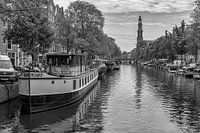 Misschien is de Prinsengracht wel de bekendste van alle grachten van Amsterdam. Je vindt er o.a. de beroemde Westerkerk en het Anne Franckhuis. Er liggen talloze woonboten in soorten en maten afgemeerd, zoals ook op dit werk te zien is.