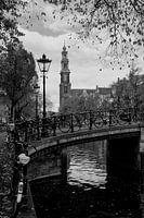 Aan de Prinsengracht in Amsterdam staat de beroemde Westerkerk. De herfstkleuren van de bomen verraden dat het najaar is.