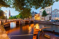 De Westerkerk en de Prinsengracht in Amsterdam in de avond.
