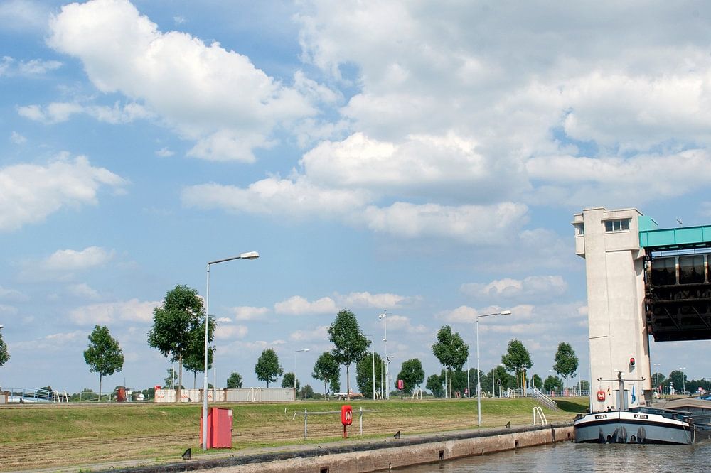 Lith Noord-Brabant Nederland The Netherlands Ships pass through the Prinses Máxima Sluizen lock gates on the River Maas.
