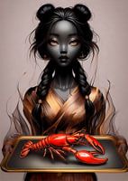 Een mooie donkere prinses, met ogen van goud, een gouden chiffon jurk en een gouden dienblad met daarop een rode kreeft. Haar mooie felle ogen kijken dwars door je heen en haar donkere lange haren zitten in een knot en in vlechten. Het beeld is met behulp van ai gegenereerd.