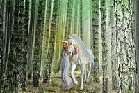 Een jonge vrouw die er uit ziet als een prinses of koningin uit een sprookje loopt tussen de bomen met een wit paard met hoorn.