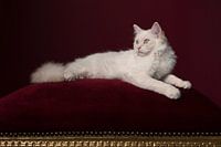 Jonge ragdoll kat met blauwe ogen op een bordeaux rood kussen tegen een bordeaux rode achtergrond