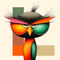 Kleurrijk, grafisch vogelportret met grote expressieve ogen in rood en groen, scherpe snavel en geometrische kleurvlakken op crèmekleurige achtergrond — speelse moderne wanddecoratie.