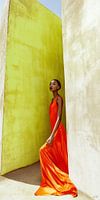 Een betoverend portret van elegantie en kleur, waarin een model in een vurige oranje jurk de zonovergoten ruimte vult met haar aanwezigheid. De contrasterende tinten van de lime-gele muren en het warme oranje van de jurk creëren een visuele symfonie die kracht en verfijning uitstraalt. De lange vloeiende lijnen van de jurk versterken…