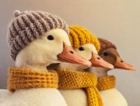 Profiel van drie koppen van eenden op een rij, met wollen mutsen en wollen sjaals. Het beeld is met behulp van ai gegenereerd.