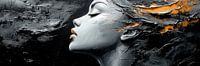 Een vrouwelijk profiel in een abstracte omgeving. De getextureerde penseelstreken geven de afbeelding een driedimensionale diepte en dynamiek die het oog van de kijker gevangen houdt. Gouden accenten zorgen voor een luxueuze en elegante toets. Dit werk is perfect voor moderne interieurs die op zoek zijn naar een combinatie van…