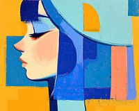 Profile Prism - Dit moderne vrouwen schilderij toont een gestileerd vrouwelijk profiel met strakke lijnen en krachtige kleurvlakken in blauw, geel en oranje.