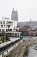 Promenade aan de oever van de Elbe bij Maagdenburg. Op de achtergrond de Dom van Maagdenburg.