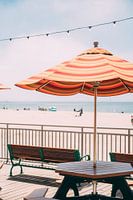 Een oranje paraplu aan een tafel op de promenade van Santa Cruz in Californië