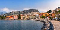 De ochtendzon baadt de huizen en daken en de boulevard van Torbole in een aangenaam warm licht.