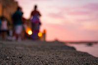Mensen, wandelend op een kade in Frankrijk. beperkte scherptediepte. Uit focus. Zonsondergang.