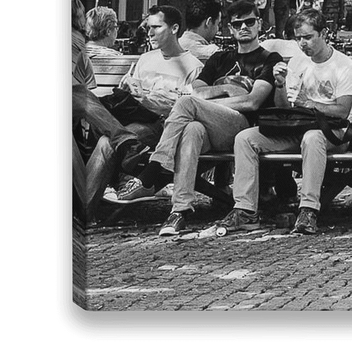 Straatbeeld in Amsterdam. Panoramafoto in zwart-wit van willekeurige personen relaxt zittend op een bank. Lopend op de voorgrond een moderne jonge vrouw. Dit product is geschikt voor grote(re) oppervlakken of als achtergrond.