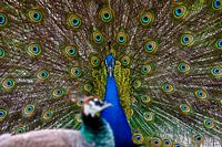 In deze foto ontvouwt een pauw zijn indrukwekkende staart in een perfecte waaier van kleur en symmetrie.