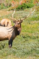 Amerikaanse Elks zijn erg grote herten, met indrukwekkende geweien. Dit mannetje wil graag even pronken met zijn kroon, tussen het grazen door. Voor de bronsttijd eten zij erg veel, omdat de bronst veel energie kost. Deze wordt direct gevolgd door de strenge winter in de Colorado Rocky Mountains. Een goede voedselvoorraad opbouwen is dan dus ook echt een must.