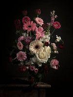 Een pronkstuk van witte en roze en rode tinten bloemen. Naar inspiratie van de pronkstukken zoals geschilderd werd door de vroege meesters in de schilderkunst.