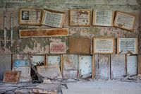 Posters met Sovjet Propaganda in Duga, een geheime radar vlakbij Chernobyl.