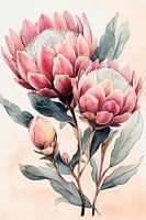 Een verfijnde botanische illustratie van roze protea bloemen, uitgevoerd in zachte aquareltinten. De compositie toont twee volledig geopende protea bloemen met hun karakteristieke pluizige kern, vergezeld door een knop in ontwikkeling. De blauwgroene bladeren vormen een elegant contrast met de roze bloemen, terwijl de zachte peachy…
