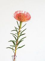 Rode protea-bloem op een glazen vaas tegen een witte achtergrond.