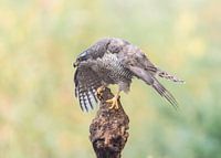 Een volwassen havik in een typerende defensieve houding met zijn vleugels gespreid en bovenop een boomstronk! Andere roofvogels waren in de buurt en kennelijk geïnteresseerd in zijn prooi! De havik komt mooi uit op de prachtige herfst achtergrond met heerlijke zachte tonen!