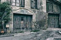 Boven de garage van oude taxibedrijf in Castellane staat nog een oude koets op de gevel in het oude straatje.
