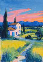 Dit kleurrijke gouache-schilderij verbeeldt het landschap van de Provence in Frankrijk. Kleine huizen met blauwe luiken staan op een geel tarweveld, omzoomd met cipressen langs de weg, met bergen op de achtergrond en een zonsondergang. Met eenvoudige vormen, levendige kleuren van roze, oranje, paars, blauw en groen, en een warme, uitnodigende sfeer, brengt het werk de charme van landelijk Frankrijk over. Het schilderij is geïnspireerd op de stijl van Matisse en vangt de vreugde en lichtheid van de Provence en is perfect voor liefhebbers van impressionistische en kleurrijke landschapskunst.
