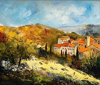 olieverf op doek 60 x 70 cm - Dit werk roept een pittoresk dorpje op, genesteld in een mediterraan landschap dat baadt in het licht. De rode daken van de huizen contrasteren met de weelderige vegetatie die bestaat uit slanke cipressen en bomen met goudkleurig gebladerte, wat een herfstsfeer suggereert. De heuvel op de achtergrond,…