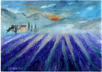 Provence, lavendelveld, zomer, geurige lavendel, nevel op de achtergrond voor een heuvelachtig gebergte, een typisch klein boerenhuisje in lokale stijl, de sfeer straalt rust en dromerigheid uit, ver weg van alle hectiek.
