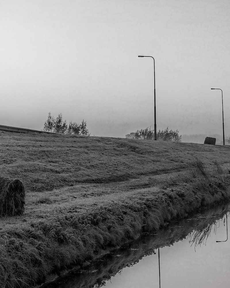Een weg met daarnaast een sloot. Op de grasstrook liggen grote balen van het recent gemaaide gras. Langs de weg staat een rij lantaarnpalen waarvan hun beeld in de sloot wordt weerspiegeld. Dit kleine stukje landschap is voor de duizenden dagelijks passerende mensen zo gewoon geworden dat men geen oog meer heeft voor de schoonheid ervan.