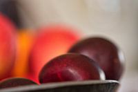 De donkerrode vooraan want deze zijn het lekkerst en wat vlezige zacht rode pruimen op de achtergrond neergelegd. Een mooi en smakelijk gekleurd geheel op een fruitschaal.