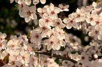 Een foto van een Pruimenboom in de vroege lente. Alle takken zitten vol met witte bloesem. Ik heb de foto redelijk dichtbij genomen zodat alle details van de bloemen goed te zien zijn.