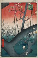 Gezicht op een boomgaard met pruimenbloesem, gezien tussen de takken door van een pruimenboom op de voorgrond; op de achtergrond picknickende bezoekers; op de voorgrond links een deel van de toegangspoort; tegen een felrode lucht.
