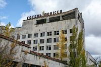 Het hotel van Pripyat, de verlaten stad vlakbij de kerncentrale van Chernobyl. Hier zijn na de ramp en de evacuatie nog vergaderingen van het leger en wetenschappers gehouden over de aanpak van de ramp.
