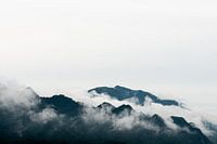 De toppen van de bergen van Pu Luong worden omgeven door witte wolken. Sterk contrast tussen de blauw lijkende bergen met de witte wolken en de witte lucht.