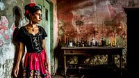 Een Mexicaanse vrouw in traditionele kleding staat naast een oude tafel met kaarsen en flessen, wat een mysterieuze sfeer creëert. De verf op de muren van de kamer bladdert af, wat bijdraagt aan de rustieke charme. Ze draagt zwart borduurwerk op haar jurk, dat contrasteert met de muur achter haar. Haar haar is versierd met bloemen. Ze…